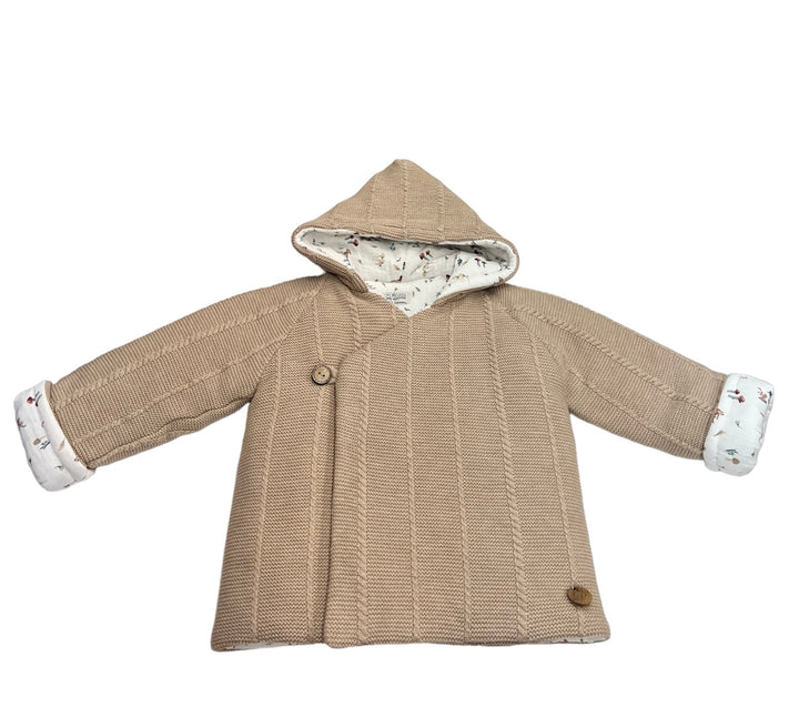 Cappottino in Filo di Cotone con Cappuccio, Foderato Interno Fantasia, Bottoncini in Legno