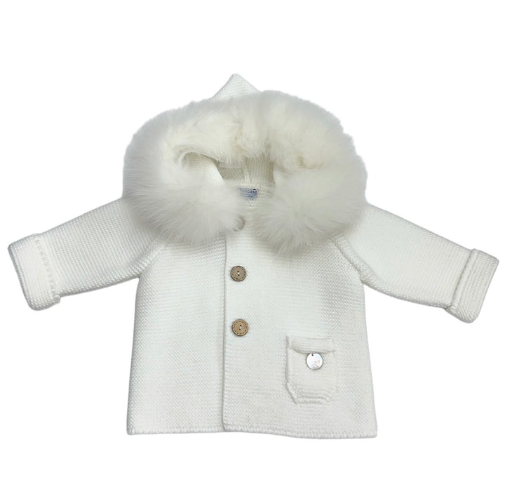 Cappottino in Filo di Cotone con Cappuccio Pelliccia, Bottoncini in Legno e Taschina