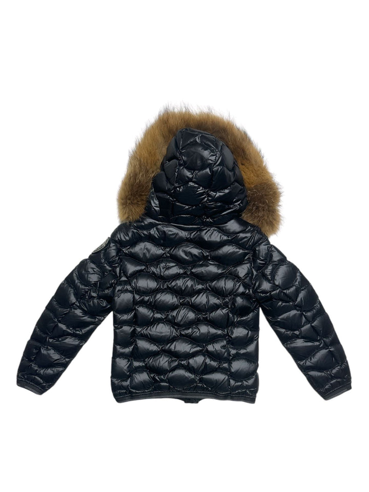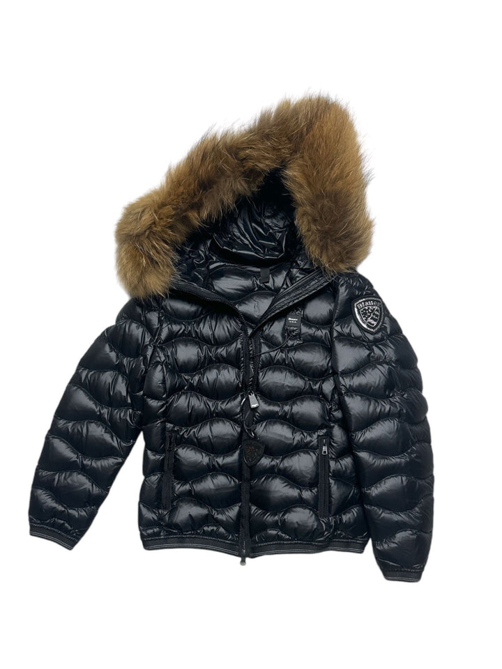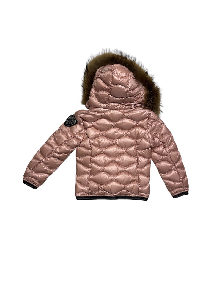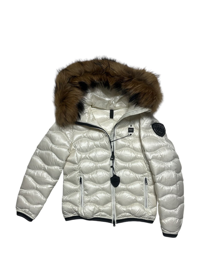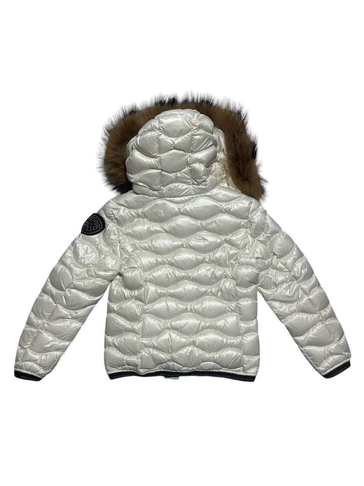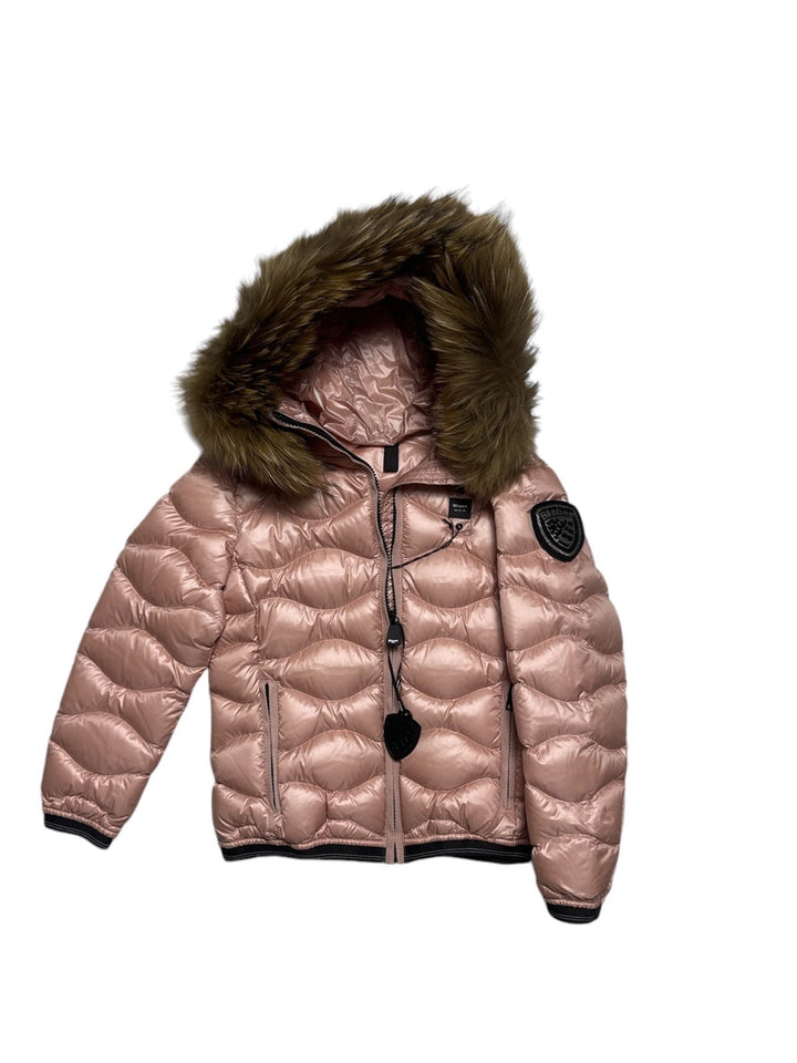 Giubbino corto imbottito in piuma d'oca con cappuccio con pelliccia naturale staccabile. modello a onde